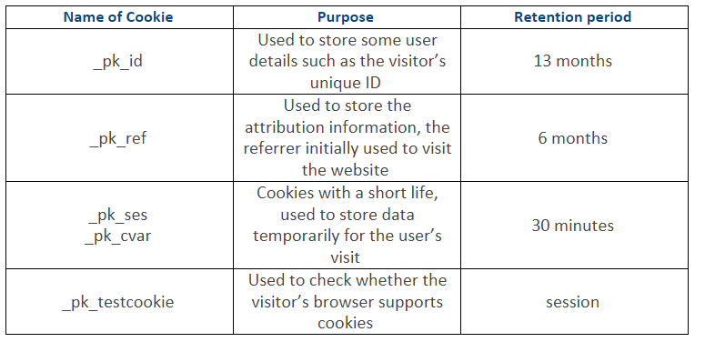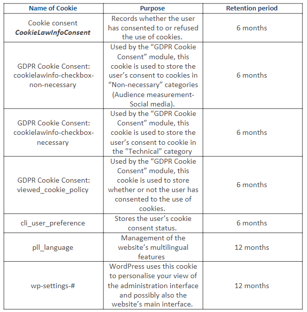 Matomo. We use Matomo audience measurement cookies, the sole purposes of which are those listed above, for our sole benefit.